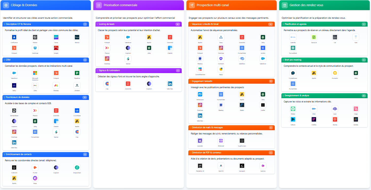 Alignement des critères de ciblage (ICP, Persona), de l’offre, des tactiques (in & outbound) et du stack outil adapté.